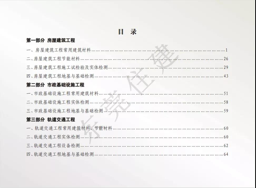 手冊将相(xiàng)關檢測項目類别、樣品種類、檢測參數、檢測依據、送檢數量等内容進行(xíng)彙總,工(gōng)程範圍涵蓋房屋建築工(gōng)程、市政基礎設施工(gōng)程以及軌道交通工(gōng)程,主要包括材料見證取樣送檢以及工(gōng)程實體質量檢測等。