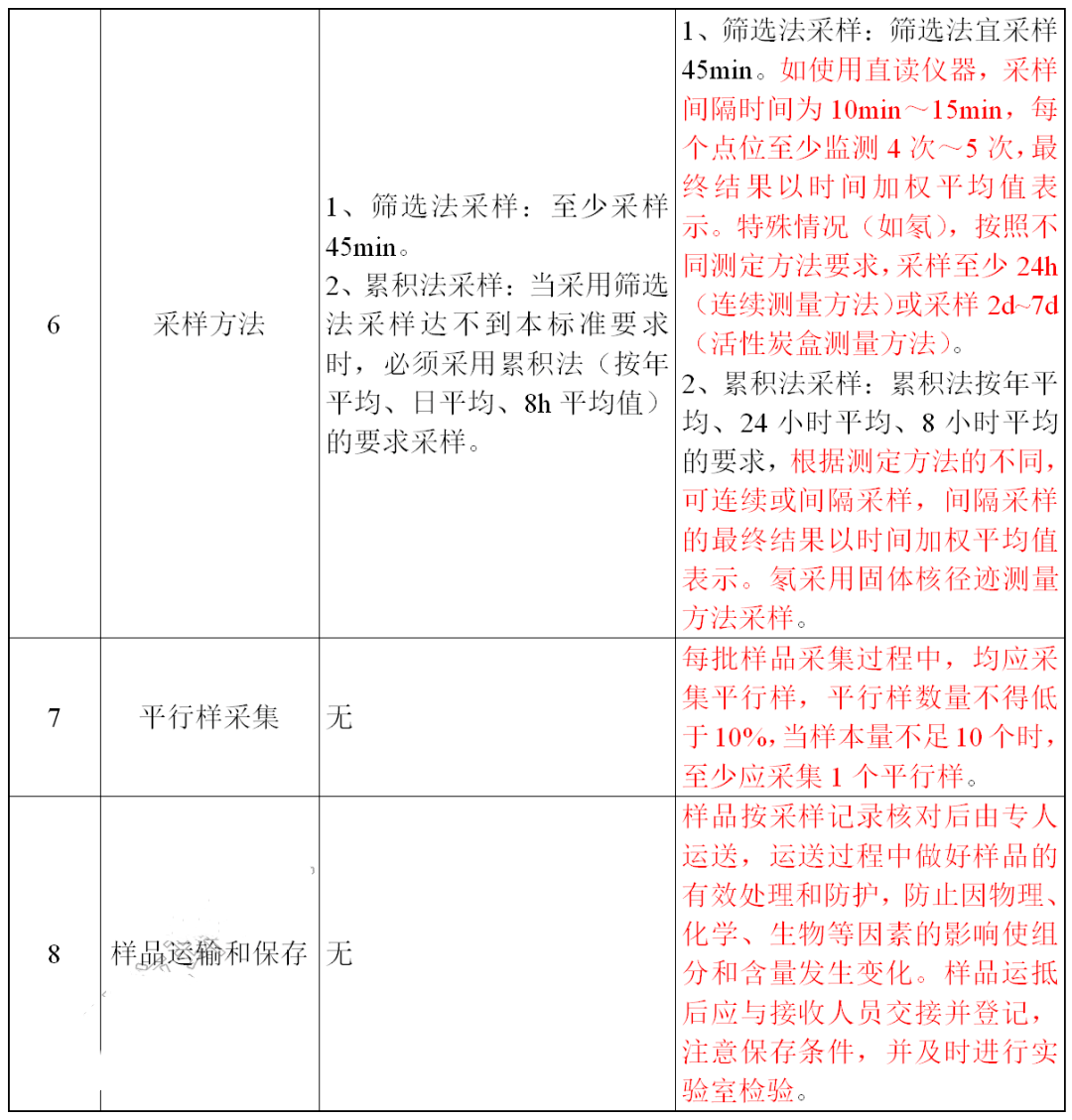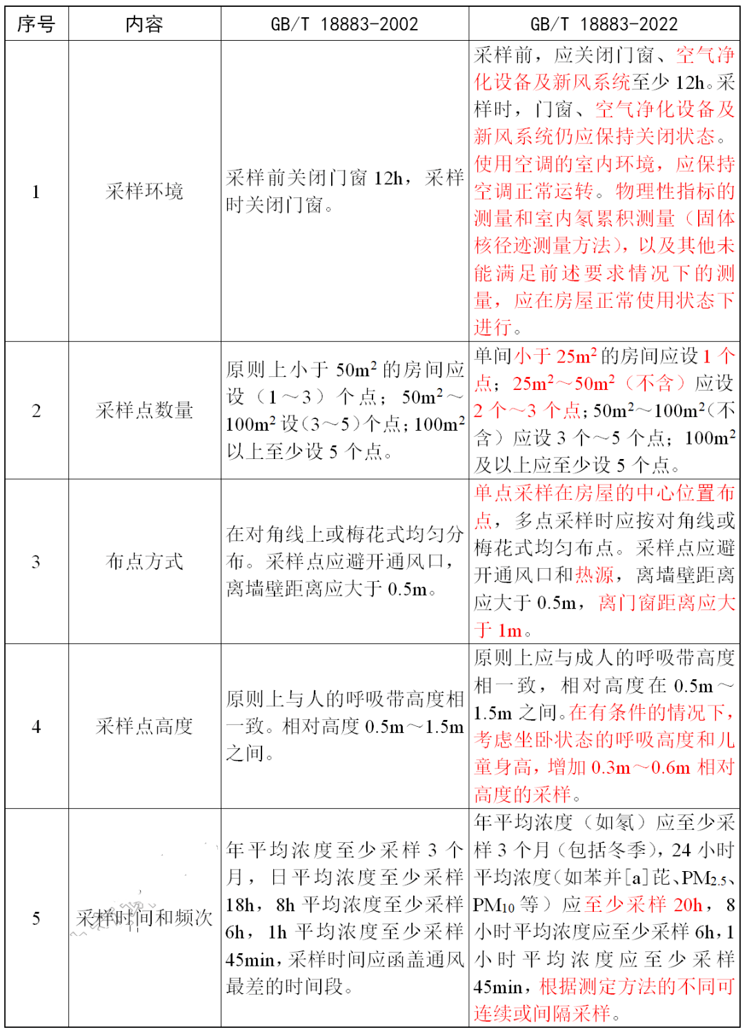(1)室内空氣采樣部分(fēn)主要修訂内容詳見下表(标紅的(de)部分(fēn)爲GB/T 18883-2022中修訂或者新增的(de)内容)。