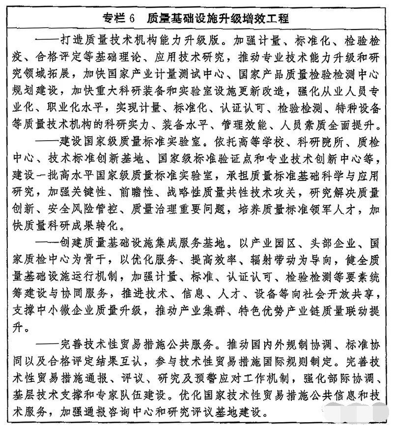 (二十三)加強質量基礎設施能(néng)力建設。合理(lǐ)布局國家、區域、産業(yè)質量技術(shù)服務機構,建設系統完備、結構優化、高(gāo)效實用(yòng)的(de)質量基礎設施。實施質量基礎設施能(néng)力提升行(xíng)動,突破量子化計(jì)量及扁平化量值傳遞關鍵技術(shù),構建标準數字化平台,發展新型标準化服務工(gōng)具和(hé)模式,加強檢驗檢測技術(shù)與裝備研發,加快認證認可(kě)技術(shù)研究由單一要素向系統性、集成化方向發展。加快建設國家級質量标準實驗室,開(kāi)展先進質量标準、檢驗檢測方法、高(gāo)端計(jì)量儀器(qì)、檢驗檢測設備設施的(de)研制(zhì)驗證。