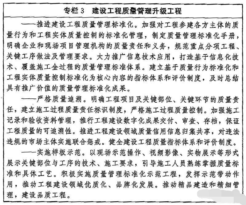 (十五)打造中國建造升級版。堅持百年大(dà)計(jì)、質量第一,樹立全生命周期建設發展理(lǐ)念,構建現代工(gōng)程建設質量管理(lǐ)體系,打造中國建造品牌。完善勘察、設計(jì)、監理(lǐ)、造價等工(gōng)程咨詢服務技術(shù)标準,鼓勵發展全過程工(gōng)程咨詢和(hé)專業(yè)化服務。完善工(gōng)程設計(jì)方案審查論證機制(zhì),突出地(dì)域特征、民(mín)族特點、時代風貌,提供質量優良、安全耐久、環境協調、社會(huì)認可(kě)的(de)工(gōng)程設計(jì)産品。加大(dà)先進建造技術(shù)前瞻性研究力度和(hé)研發投入,加快建築信息模型等數字化技術(shù)研發和(hé)集成應用(yòng),創新開(kāi)展工(gōng)程建設工(gōng)法研發、評審、推廣。加強先進質量管理(lǐ)模式和(hé)方法高(gāo)水(shuǐ)平應用(yòng),打造品質工(gōng)程标杆。推廣先進建造設備和(hé)智能(néng)建造方式,提升建設工(gōng)程的(de)質量和(hé)安全性能(néng)。大(dà)力發展綠(lǜ)色建築,深入推進可(kě)再生能(néng)源、資源建築應用(yòng),實現工(gōng)程建設全過程低碳環保、節能(néng)減排。
