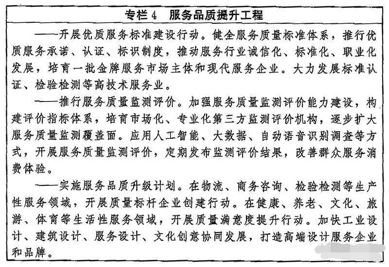 (七)提高(gāo)産業(yè)質量競争水(shuǐ)平。推動産業(yè)質量升級,加強産業(yè)鏈全面質量管理(lǐ),著(zhe)力提升關鍵環節、關鍵領域質量管控水(shuǐ)平。開(kāi)展對标達标提升行(xíng)動,以先進标準助推傳統産業(yè)提質增效和(hé)新興産業(yè)高(gāo)起點發展。推進農(nóng)業(yè)品種培優、品質提升、品牌打造和(hé)标準化生産,全面提升農(nóng)業(yè)生産質量效益。加快傳統制(zhì)造業(yè)技術(shù)叠代和(hé)質量升級,強化戰略性新興産業(yè)技術(shù)、質量、管理(lǐ)協同創新,培育壯大(dà)質量競争型産業(yè),推動制(zhì)造業(yè)高(gāo)端化、智能(néng)化、綠(lǜ)色化發展,大(dà)力發展服務型制(zhì)造。加快培育服務業(yè)新業(yè)态新模式,以質量創新促進服務場(chǎng)景再造、業(yè)務再造、管理(lǐ)再造,推動生産性服務業(yè)向專業(yè)化和(hé)價值鏈高(gāo)端延伸,推動生活性服務業(yè)向高(gāo)品質和(hé)多樣化升級。完善服務業(yè)質量标準,加強服務業(yè)質量監測,優化服務業(yè)市場(chǎng)環境。加快大(dà)數據、網絡、人(rén)工(gōng)智能(néng)等新技術(shù)的(de)深度應用(yòng),促進現代服務業(yè)與先進制(zhì)造業(yè)、現代農(nóng)業(yè)融合發展。