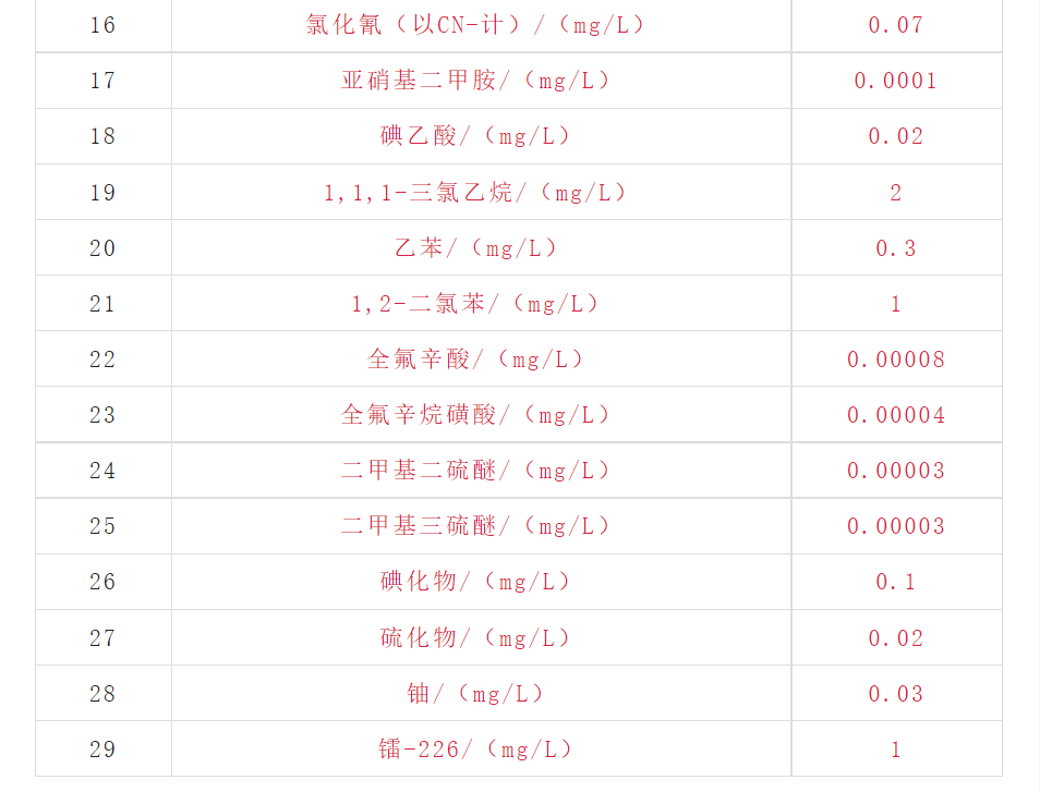 附錄 A(資料性)水(shuǐ)質參考指标由 GB 5749-2006的(de) 28項調整到(dào) 55項。其中新增了29項指标,包括釩、六六六(總量)、對硫磷、 甲基對硫磷、林丹、滴滴涕、敵百蟲、甲基硫茵靈、稻瘟靈、氟樂(yuè)靈、甲霜靈、西(xī)草(cǎo)淨、乙酰甲胺磷、甲醛、三氯乙醛、氯化氰(以CN-計(jì))、亞硝基二甲胺、碘乙酸、1,1,1-三氯乙烷、乙苯、1,2-二氯苯、全氟辛酸、全氟辛烷磺酸、二甲基二硫醚、二甲基三硫醚、碘化物(wù)、硫化物(wù)、鈾、鐳-226;删除了2項指标,包括 2-甲基異莰醇和(hé)土(tǔ)臭素;修改了 3項指标的(de)名稱,包括二溴乙烯名稱修改爲1,2-二溴乙烷、亞硝酸鹽名稱修改爲亞硝酸鹽(以N計(jì))、石棉(>10μm)名稱修改爲石棉(纖維>10μm);;調整了1項指标的(de)限值,爲石油類 (總量)。