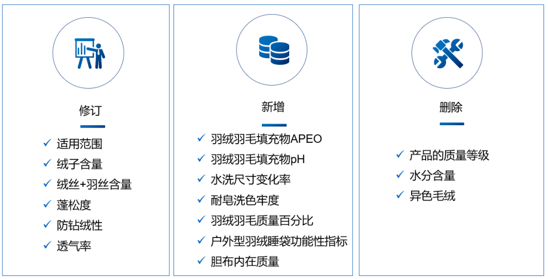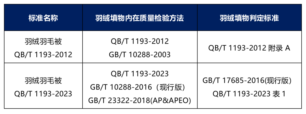 變化:明(míng)确了隻“适用(yòng)于羽絨被、羽毛被、複合羽絨被和(hé)複合羽毛被産品”,而“不适用(yòng)于羽絨羽毛和(hé)其他(tā)填充材料共混填充的(de)被類産品”。