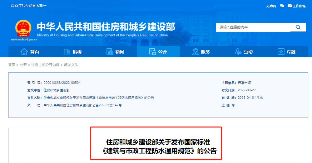 2022年10月(yuè)24日住建部官網發布公告《建築與市政工(gōng)程防水(shuǐ)通用(yòng)規範》正式發布,2023年4月(yuè)1日起實施。