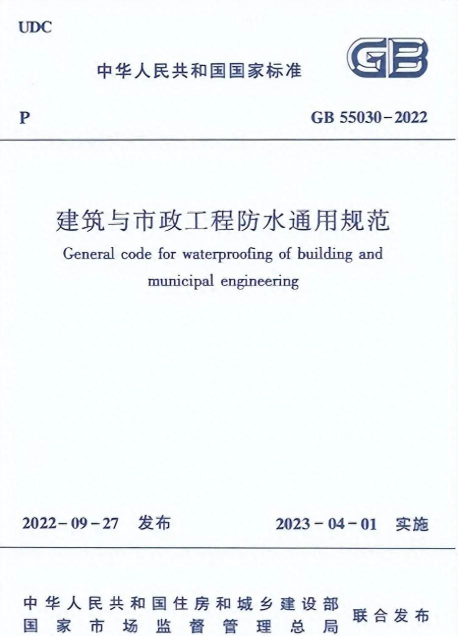 《建築與市政工(gōng)程防水(shuǐ)通用(yòng)規範》,編号爲GB55030-2022,自2023年4月(yuè)1日起實施,此規範爲強制(zhì)性工(gōng)程建設規範,全部條文(wén)必須嚴格執行(xíng)。從業(yè)人(rén)員稱其爲史上(shàng)最嚴防水(shuǐ)規範。