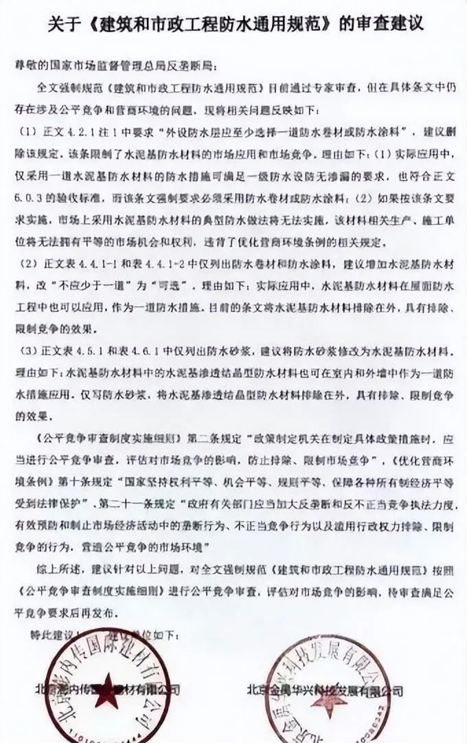 《建築與市政防水(shuǐ)通用(yòng)規範》被多家防水(shuǐ)企業(yè)舉報涉嫌違法