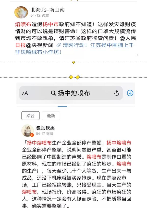 記者在網絡上(shàng)搜索“揚中熔噴布”,一些網友(yǒu)的(de)留言反映了消費者對于劣質熔噴布被用(yòng)來生産口罩的(de)極大(dà)擔憂。