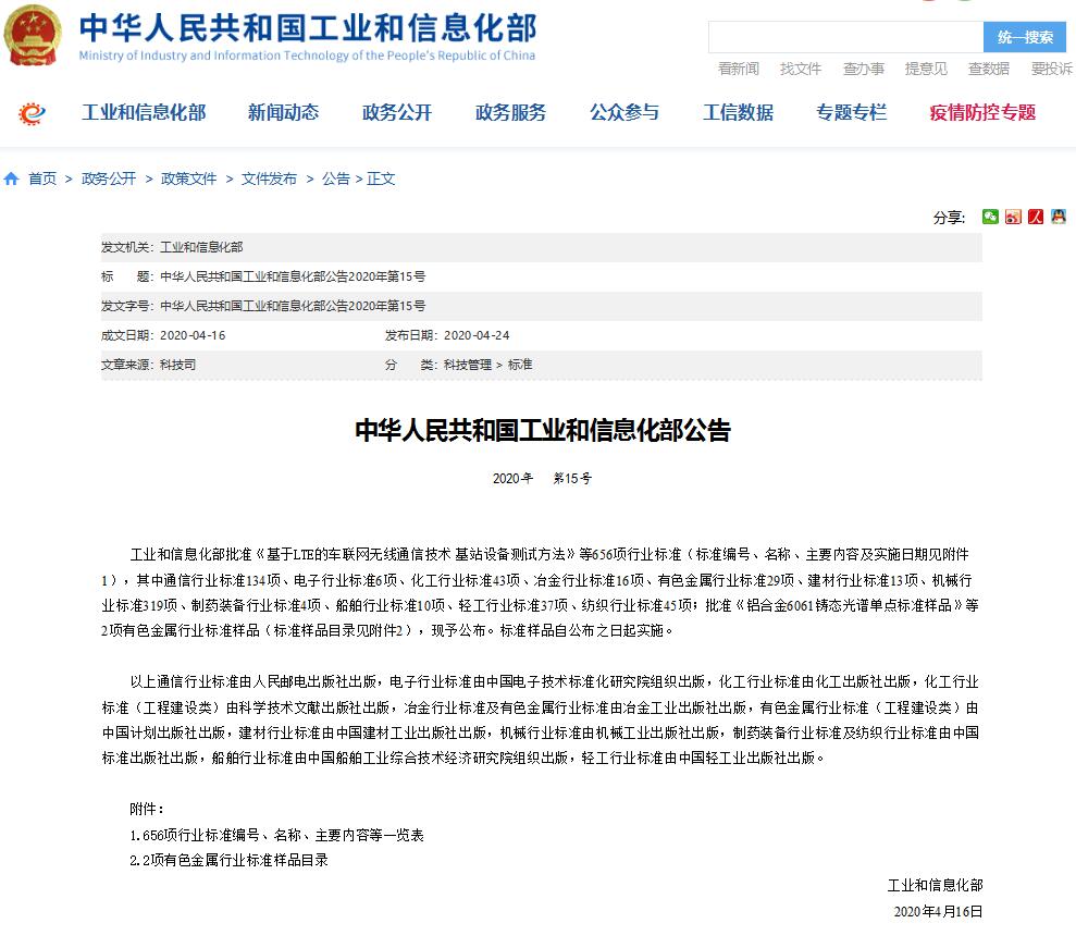 近日,工(gōng)業(yè)和(hé)信息化部發布2020年第15号公告,批準《基于LTE的(de)車(chē)聯網無線通信技術(shù)基站設備測試方法》等656項行(xíng)業(yè)标準,其中涉及建材行(xíng)業(yè)标準13項,由中國建材工(gōng)業(yè)出版社出版。