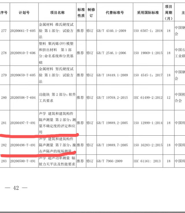 根據國家标準化管理(lǐ)委員會(huì)《關于下達2020年推薦性國家标準計(jì)劃(修訂)的(de)通知》(國标委發〔2020〕6号),聲标建聲分(fēn)會(huì)組織推薦、并經聲标委系統上(shàng)報的(de)GB/T19889.2《聲學 建築和(hé)建築構件(jiàn)隔聲測量 第2部分(fēn):測量不确定度的(de)評定和(hé)應用(yòng)》和(hé)GB/T19889.7《第7部分(fēn):撞擊聲隔聲的(de)現場(chǎng)測量》已正式列入國标修訂計(jì)劃,将由中國建築科學研究院有(yǒu)限公司、東南大(dà)學等單位共同開(kāi)展修訂工(gōng)作。現公開(kāi)邀請修訂參編單位,有(yǒu)意者請聯系編制(zhì)組。