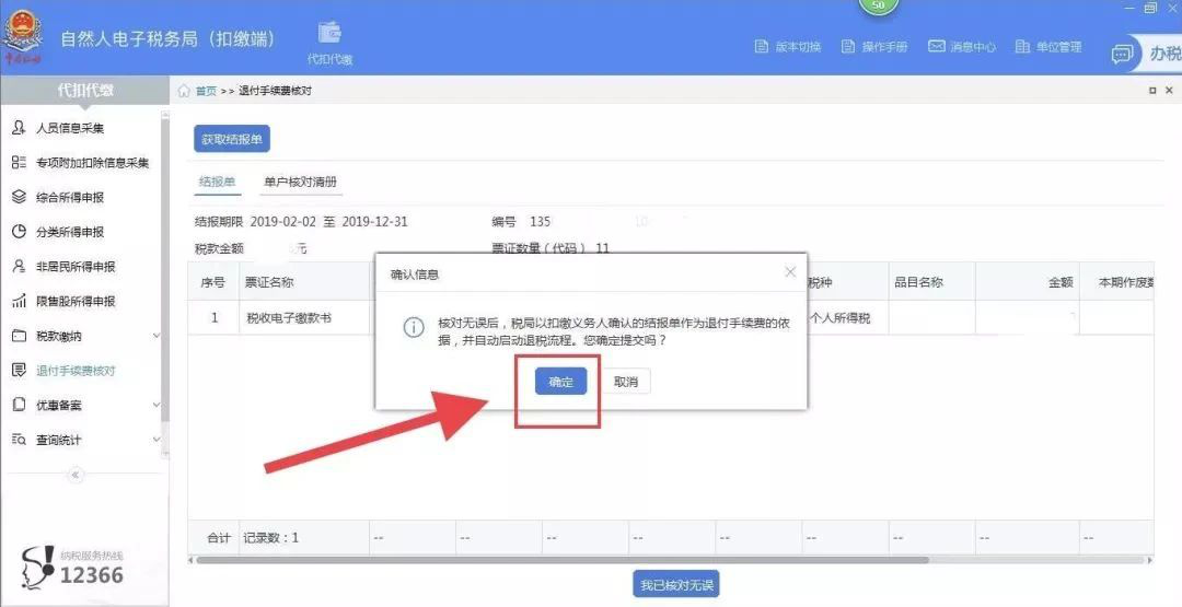 點擊“我已核對無誤”後系統彈出“代扣代繳手續費退費申請”,選擇“開(kāi)戶銀行(xíng)”、“銀行(xíng)賬号”,“開(kāi)戶銀行(xíng)網點”自動帶出。閱讀(dú)聲明(míng)後,點擊“提交”。提示信息“确認成功”彈框,點擊“确定”。完成後系統将推送至稅務機關審核,等待審核完成後,即可(kě)返還對應的(de)手續費。